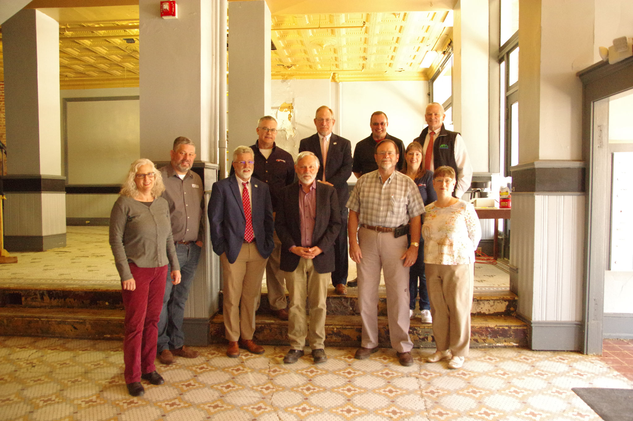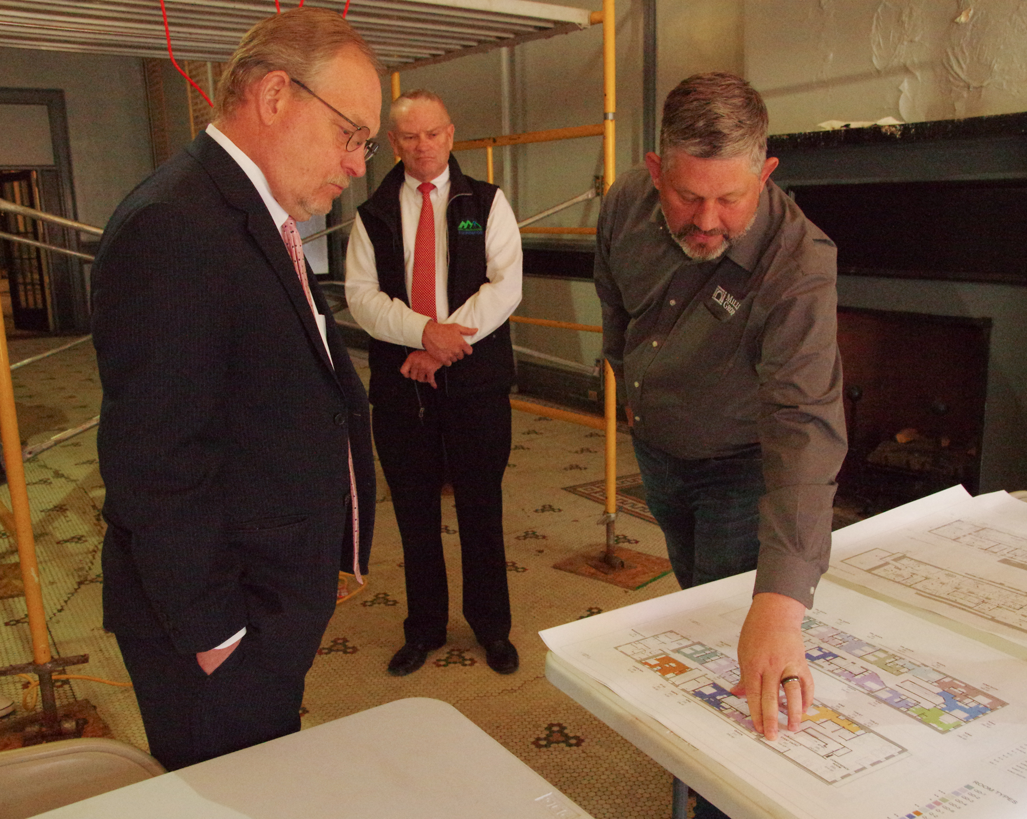 - Representatives from Woodlands, Freedom Bank, Pendleton Community Bank, and Davis Trust Company gather in the lobby of the Tygart Hotel which is currently undergoing renovation.